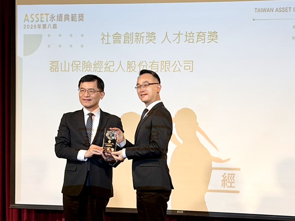 磊山保險經紀人榮獲2026年第八屆ASSET永續典範獎「社會創新獎-人才培育獎」,由總經理許弘偉代表公司,自經濟部政務次長何晉滄手中接下這份肯定。繼2025年獲得第七屆ASSET永續典範獎「社會企業永續發展獎-社會共好獎」後,磊山保經今年以創新人才培育方式,再度獲得評審給予典範獎首獎肯定,彰顯磊山以創新模式推動人才發展的實質成效。